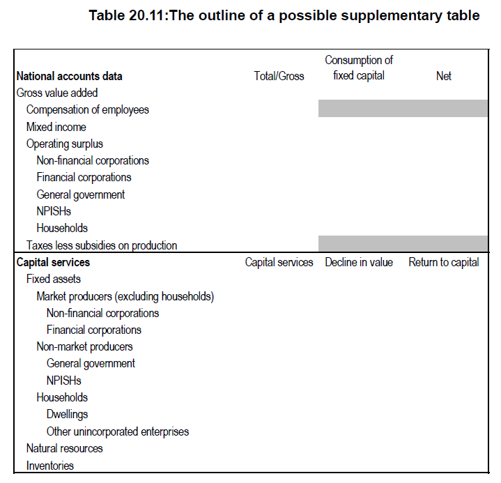 The analytical concept of capital services has been introduced. Details can be presented in a supplementary table for market producers, bringing into the SNA the advances in research in recent decades in the fields of growth and productivity and helping to satisfy the analytical needs of many users. ¶